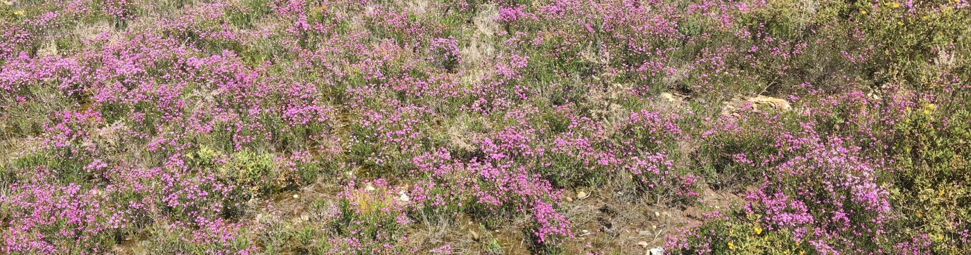 Caminhar na Serra, seja ela qual for, implica subir… e descer… tantas vezes quantas as necessárias para chegar ao destino. A meio não se fica, isso é certo. As inclinações são estupidamente inclinadas, muito à conta dos corta-fogos feitos durante o período de incêndios. Conseguimos contornar algumas, outras não deu para evitar o quase desfalecimento. As flores coloridas acompanharam quase todo o caminho e ajudaram a manter o foco no que era realmente essencial, chegar ao prémio de consolação.